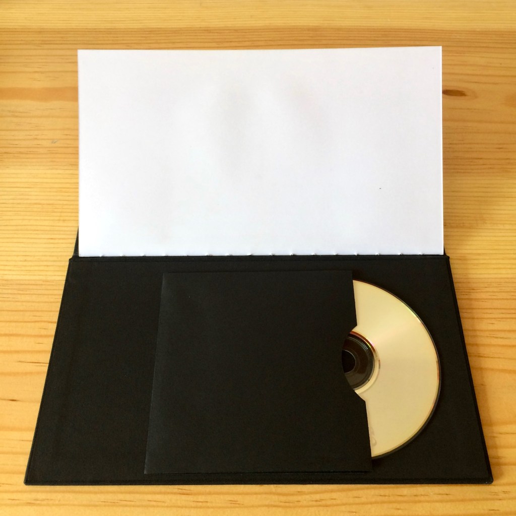Encuadernación de un sólo cuadernillo, formato apaisado, portadas forradas con tela brillanta color negro. Sobre para CD en la parte posterior.