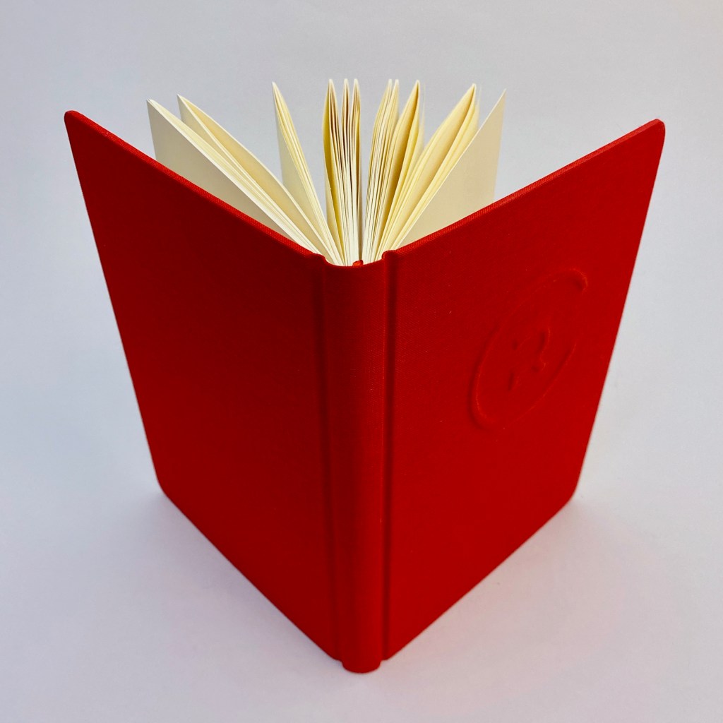 Libreta con logotipo en relieve de Ro Chávez, weeding planner. Portadas forradas con brillanta color rojo y listón separador.