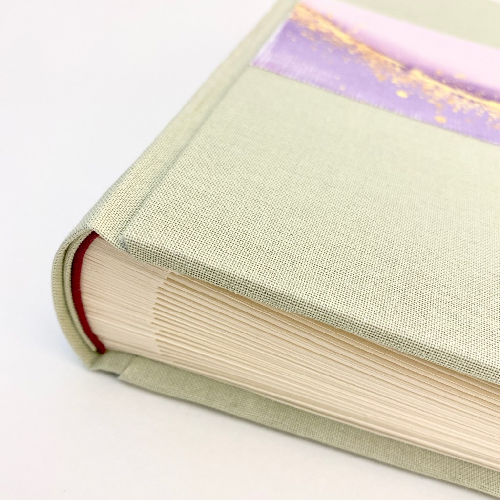 Encuadernación bardal en 3 partes, con portadas forradas con brillanta color verde claro. Nombres de la pareja en la portada, diseño impreso en formato circular, en bajorrelieve, con diseño horizontal con detalles en dorado pintados a mano.