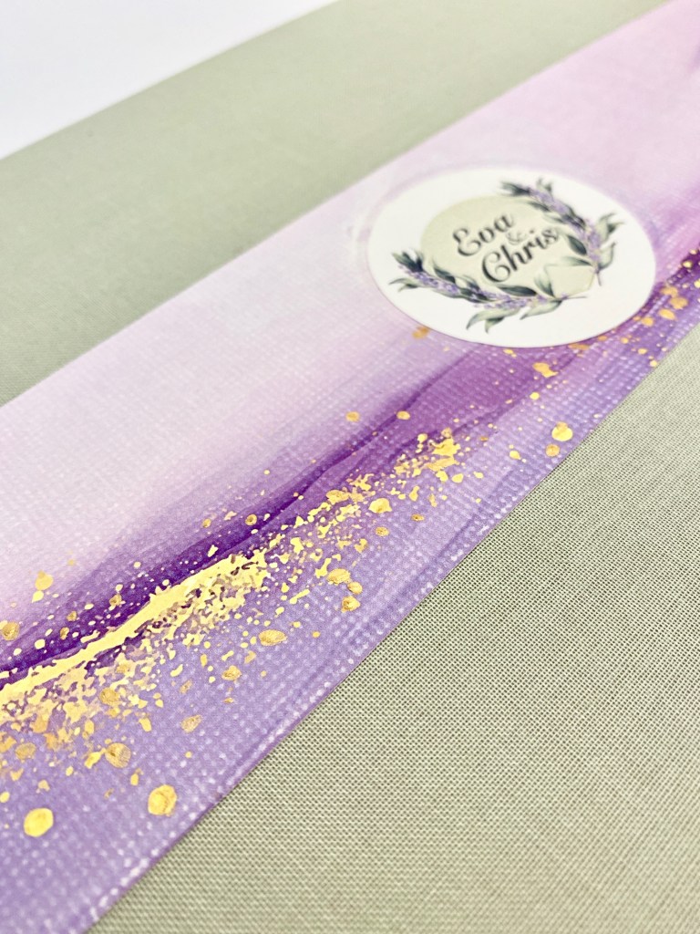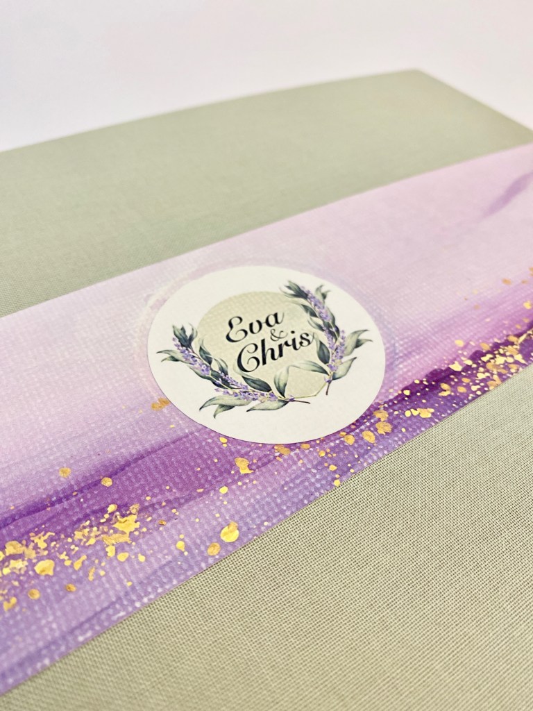 El diseño evoca la esencia delicada de la flor de lavanda, utilizando una suave paleta de colores que combina tonos lavanda, lilas y toques de dorado. Al centro y alrededor de los nombres de la pareja, pequeñas ramitas de lavanda se entrelazan.