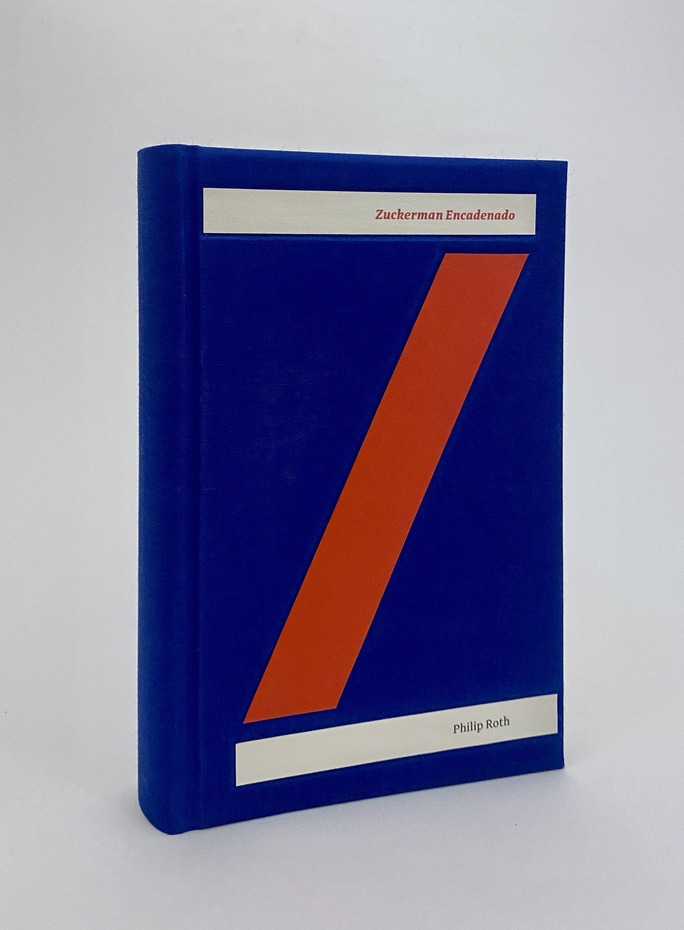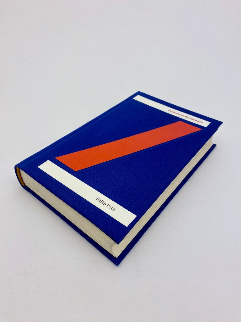 Reencuadernación del libro «Zuckerman encadenado». Portadas forradas con tela brillanta color azul marino. Mosaico en bajorrelieve en papel con forma de «Z» donde incluye el título y nombre del autor. Cabezadas tejidas a mano.