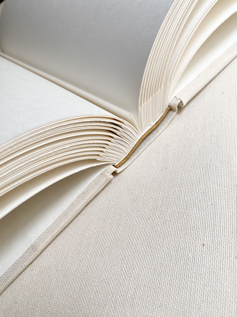 Este álbum fue realizado con una estructura Bradel en tres partes, destacando el equilibrio perfecto entre diseño funcional y estética artesanal. Para las portadas, utilizamos una hermosa tela de lino, elegida por su textura natural y duradera, que aporta una sensación cálida y sofisticada al acabado.