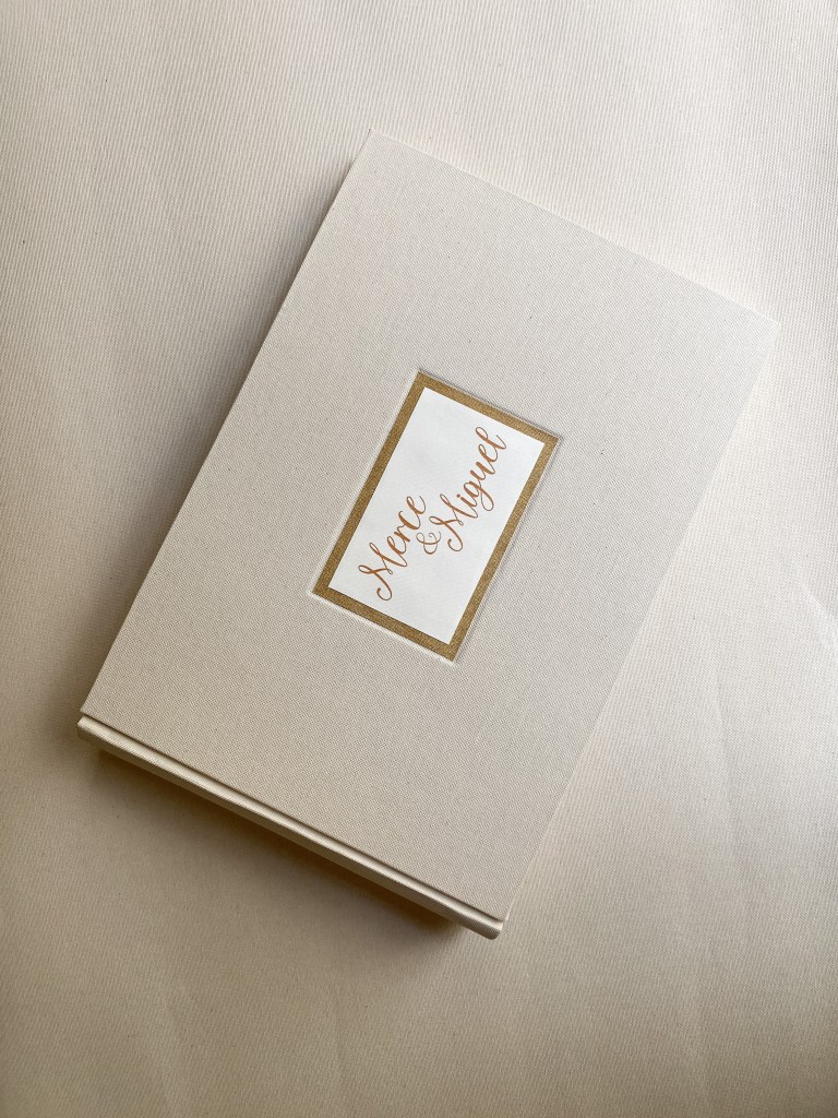 El toque especial está en la portada personalizada, en un juego de relieves, el nombre de la pareja en color dorado sobre un papel de alto gramaje y textura, con un marco de tela en el mismo tono que realza este detalle sobrio y elegante.