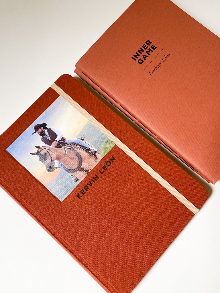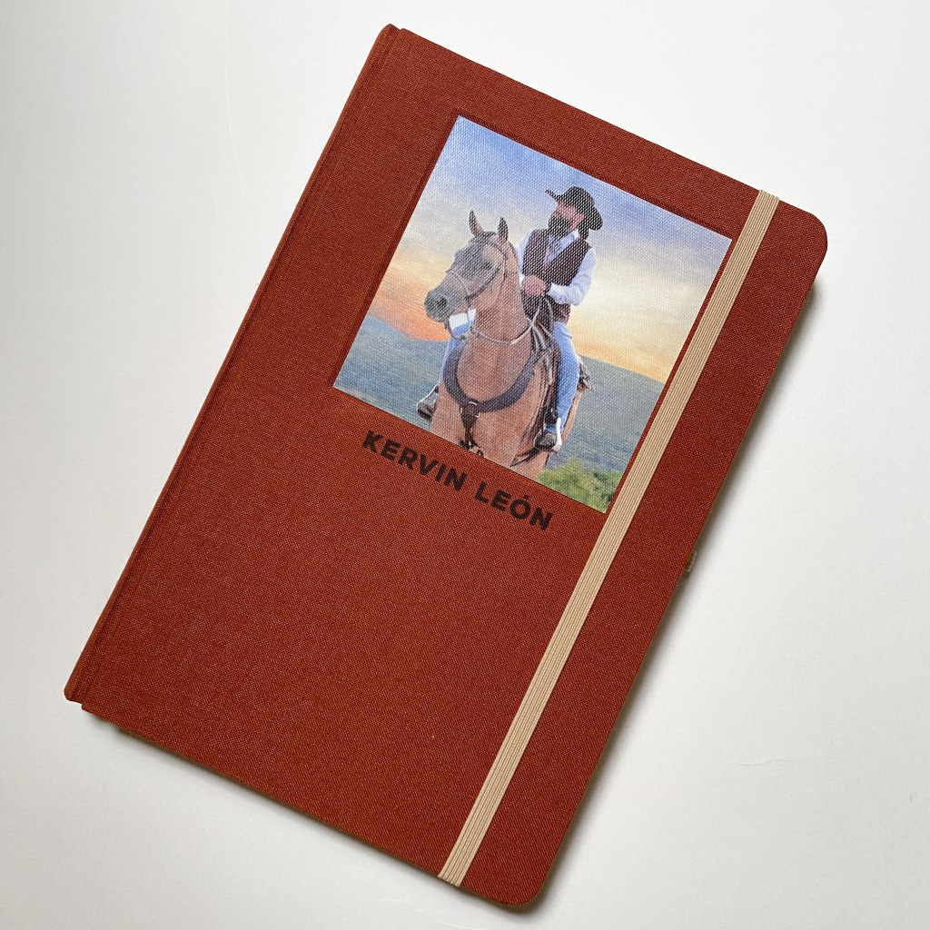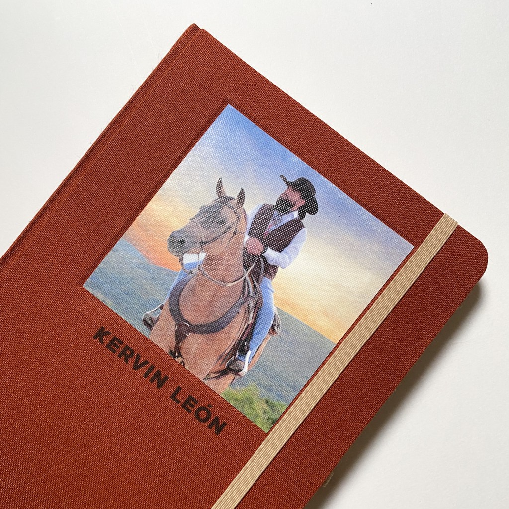 El primer diseño es una libreta con una fotografía de Kervin León en un caballo, pues el taller era sobre equinoterapia. Como muchas de las libretas que realizamos, tiene elástico de cierre y listón separador. Es muy práctico e ideal para el uso cotidiano.